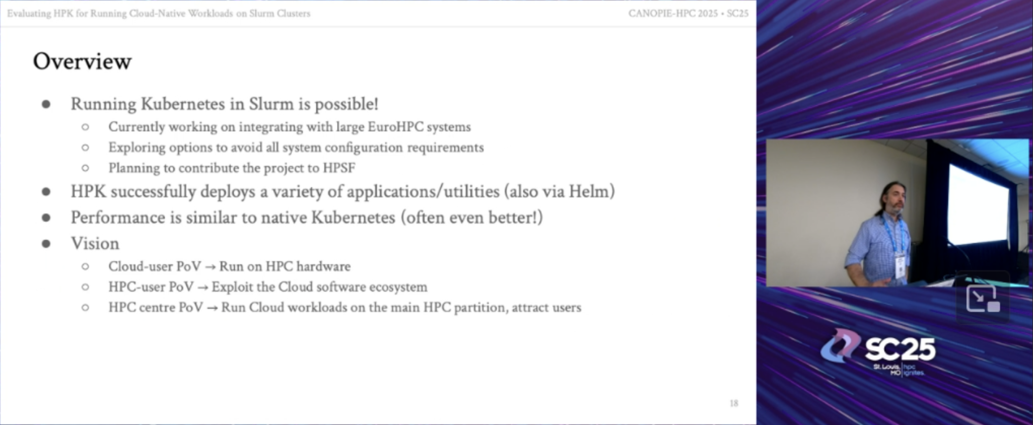 FORTH recently participated in the 7th International Workshop on Containers and New Orchestration Paradigms for Isolated Environments in HPC (CANOPIE-HPC), held as part of SC25. Antony Chazapis (FORTH) presented the paper, “Evaluating HPK for Running Cloud-Native Workloads on Slurm Clusters,” co-authored with Lefteris Vassilakis (FORTH), Giannis Petsis (FORTH; University of Crete), Manolis Marazakis (FORTH), and Angelos Bilas (FORTH; University of Crete).